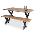 Add some rustic yet contemporary style to any space with this Live Edge X-Base Bench. Crafted from one-inch thick acacia wood protected by a layer of sealant and acylic laquer, this bench is supported by durable, matte-black X-style trestle metal legs.
