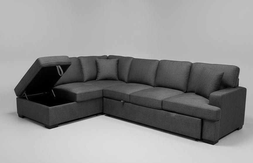 This MALDON modern fabric sofa bed sectional promises endless comfort and style. With two toss pillows and storage in the chaise, this piece is perfect for making the most of your living space. Enjoy cozy nights in, tailored to your exact needs!